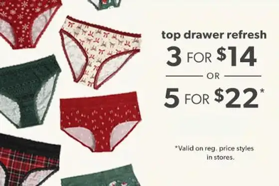 Get it while it lasts! Shop in store and get 3 for $14 or 5 for $22 panties.