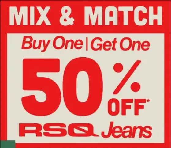 Hurry in and buy one, get one 50% off RSQ jeans in store for a limited time.