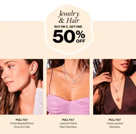 Shop in store and buy one, get one 50% off jewelry & hair for a limited time.